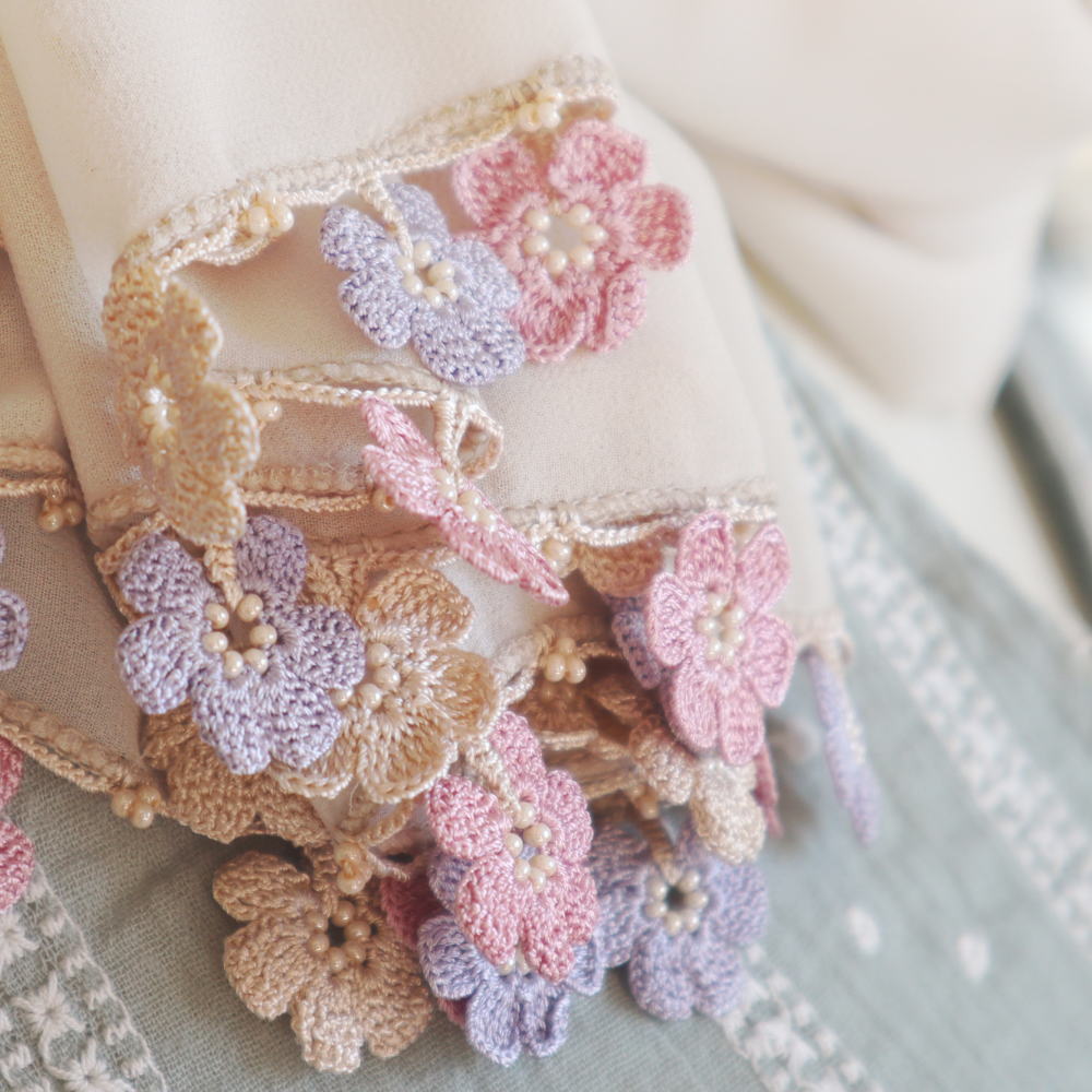小花のモチーフ「マリー」をたっぷり飾ったシフォンベースのストールです。