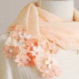 ベースはさらりとした手触りのシフォンを使い、ストールの上下に約4cmの「デイジー」を14個かざりました。「デイジー」のモチーフは、シンプルですが、実は作るのが難しいもの。中央の雌しべの丸み、花びらの丸…