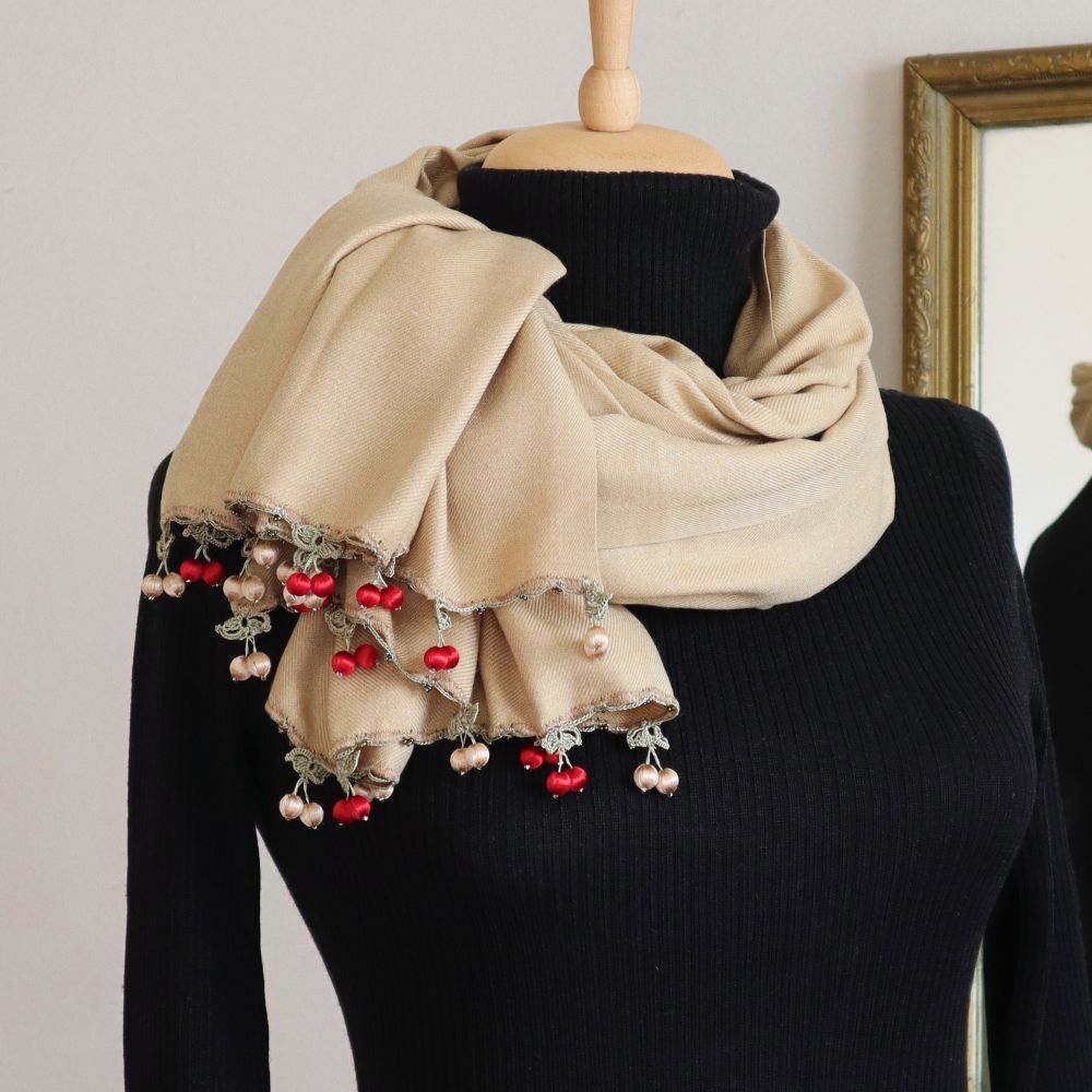 8mmサイズの小粒のさくらんぼが、キュートに揺れるストール。
