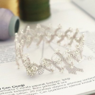 菱形の中にはビーズの花のモチーフを編み込んでいます。
