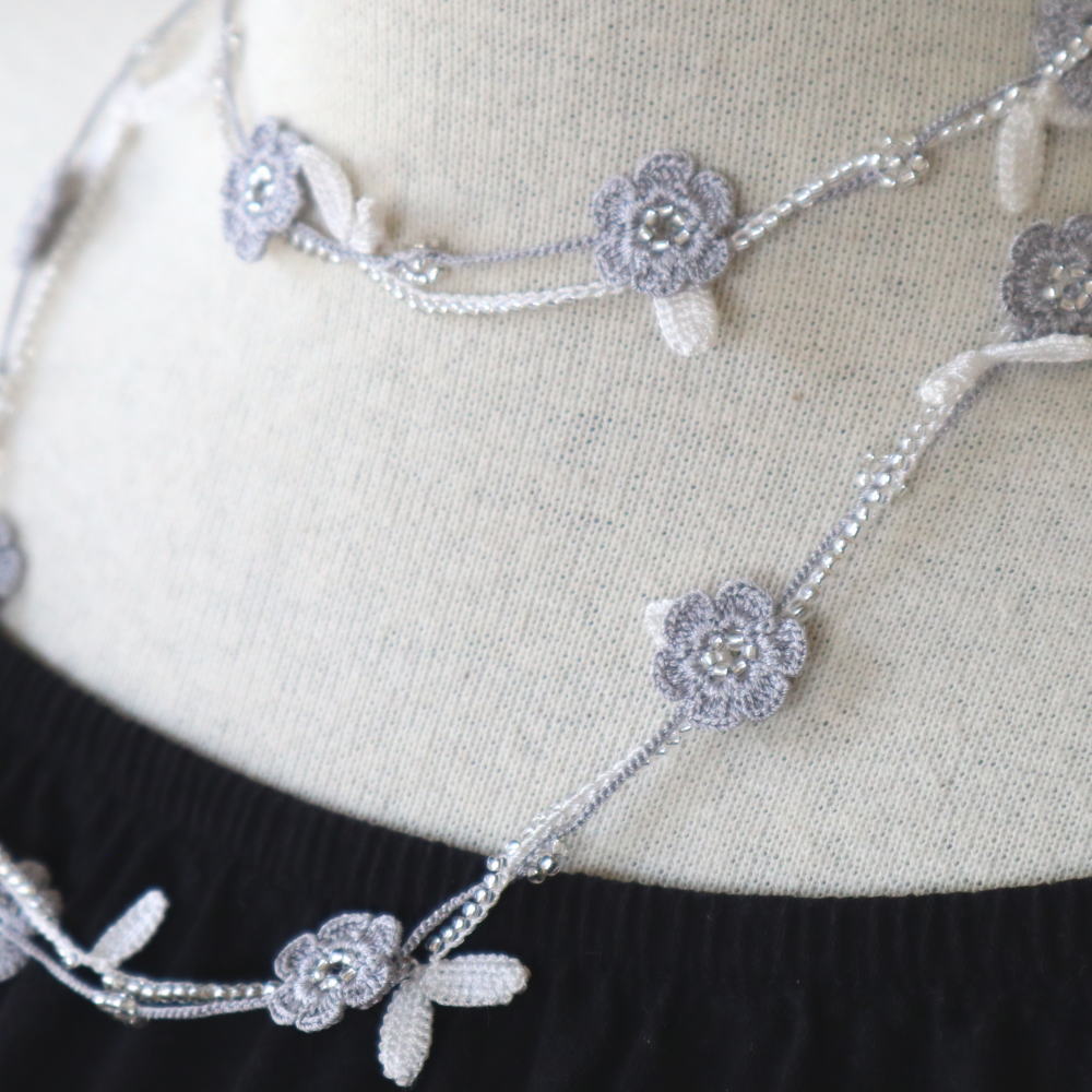 もう一本には、葉っぱを飾った二本作りの「マリー」ネックレスを、90cmのロングサイズで作りました。